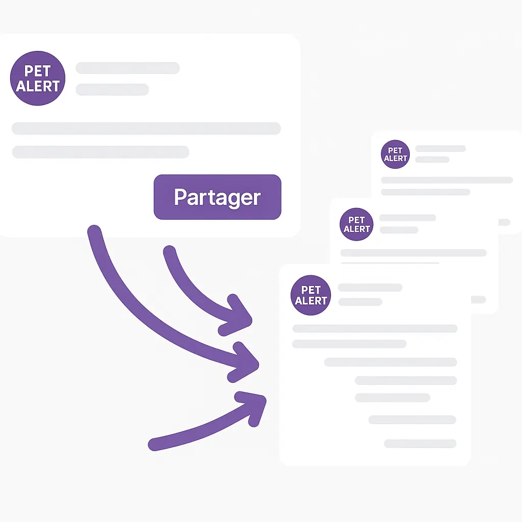 Votre annonce est ensuite diffusée dans nos groupes communautaires locaux, et republiée sur de nombreux groupes partenaires où voisins et bénévoles échangent chaque jour pour aider à retrouver les animaux perdus.